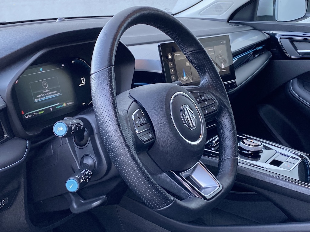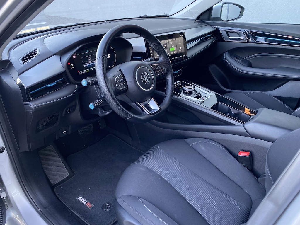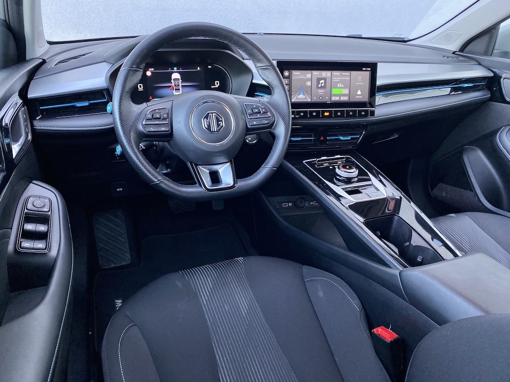 Umjesto velikih digitalnih zaslona i komandi u domeni virtualnog upravljanja, što često susrećemo kod suvremenih e-automobila, MG5 je tradicionalist u zdravom smislu. Vozačko okruženje ima obrise standardnog kokpita, a raznim funkcijama se rukuje pretežno putem fizičkih tipki, gumba i ručica. Jedino je mjenjač – točnije izbornik smjera kretanja – realiziran avangardno, pomoću horizontalno postavljenog upravljačkog kotača koji je smješten priručno, na središnjem grebenu. Ergonomija kabine je odlična, sjedala su jako udobna, mjesta ima dovoljno i sprijeda i straga, a serijska oprema je dobro osmišljena i zaista bogata.
