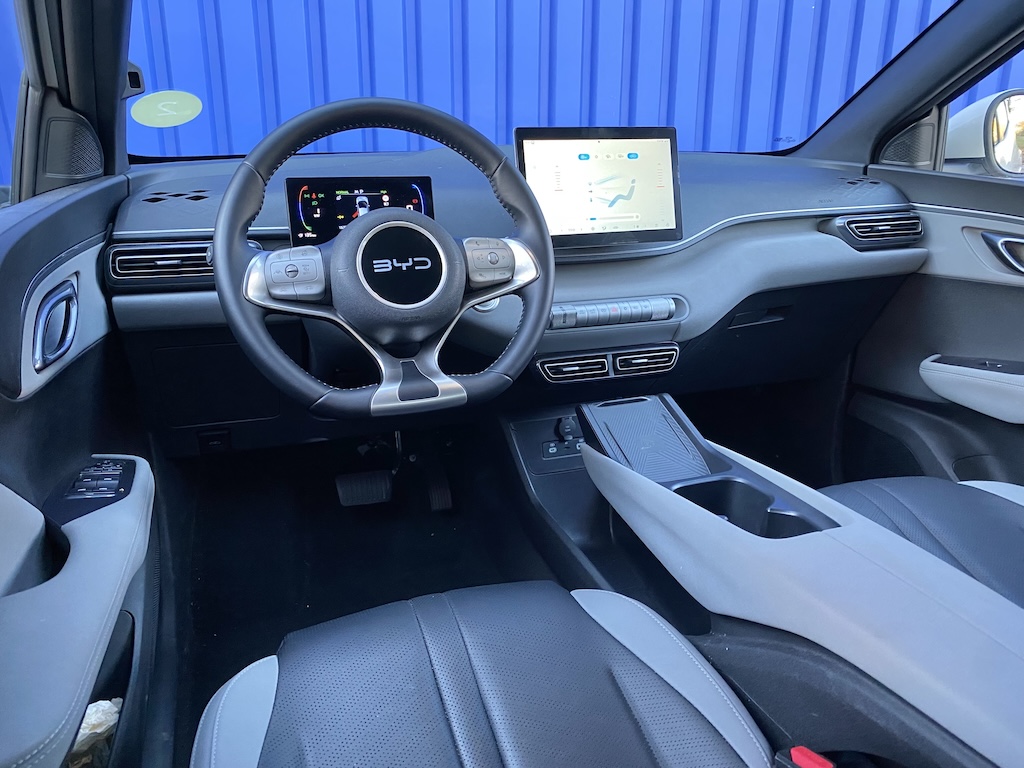 Unutrašnjost Dolphin Surfa je jednostavna, u najboljem smislu te riječi. Osmišljena je uz isti minimalistički dizajn kao i kod većih BYD modela, samo u manjem mjerilu. Takav pristup bez dileme funkcionira i sa estetske i ergonomske strane. Interijer je izveden u kombinaciji kvalitetne, teksturirane, ali krute plastike koja prekriva gornji (od vozača udaljeni) dio armaturne ploče i panele vrata, i vrhunskih materijala poput umjetne kože kojom su obložena područja najbliža putnicima. Putnička kabina nudi izvrsnu udobnost za četiri osobe, uz brojne pretince za sitnice.