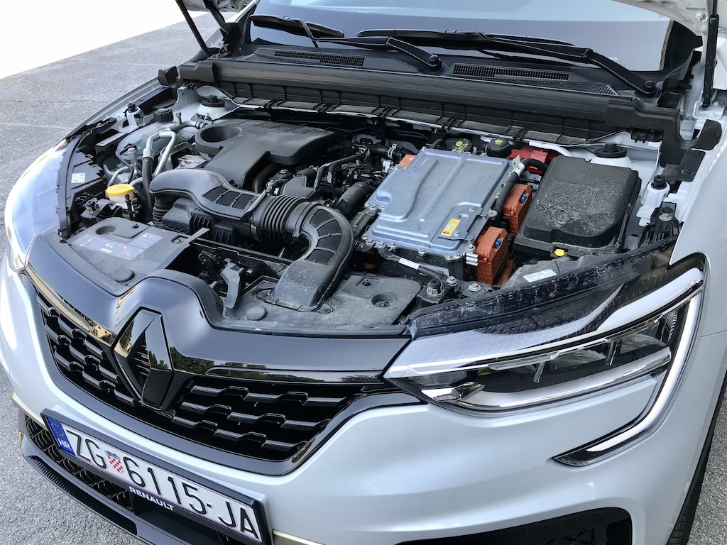 Mehanička shema E-Tech pogona sastoji se od atmosferskog benzinca koji radi u Atkinsonovom ciklusu i dva elektromotora. Sistemska snaga pogonskog sklopa je 143 KS. Veći elektromotor radi u simbiozi s benzincem, na način da se izmjenjuju ili udružuju u osiguravanju prednje vuče, ovisno o uvjetima. Manja električna jedinica (15 kW) je starter i generator. Omogućuje povrat energije tijekom kočenja i sinkronizira okretaje termičkog motora pri izmjeni stupnjeva prijenosa, što je neophodno zbog unikatne Multimode getribe koja radi bez gubitka vučne sile. Genijalan je to Renaultov izum: ima samo dva stupnja prijenosa na električnoj strani i četiri na termičkoj, za više od 16 mogućih kombinacija uključujući stupanj prijenosa za (uvijek električnu) vožnju unatrag.