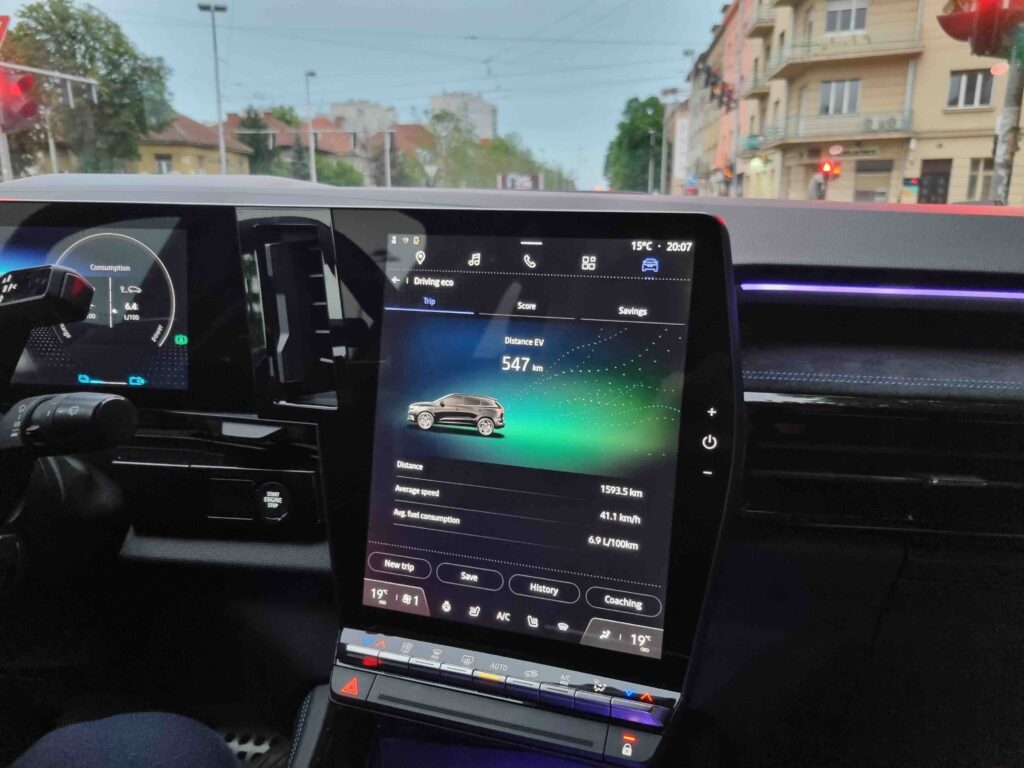 Isto vrijedi i za tišinu u vožnji koju osigurava snažan hibridni motor. Potpuni hibridni pogonski sklop E-Tech 200 sastoji se od malog turbobenzinca i električnog pogonskog motora koji se napaja iz baterije kapaciteta 1.7 kWh. Sinkronizaciju prijenosa osigurava 5-stupanjski automatski mjenjač bez spojke s dodatna dva stupnja na električnoj strani. Nećemo trošiti prostor za tehničku ekspertizu, samo konstatirati kako je ovo Renaultova ekskluziva i da u praksi Austral E-Tech uvijek kreće na struju i nastavlja je koristiti većinu vremena – ako ste u gradu, čak i do 80 posto.