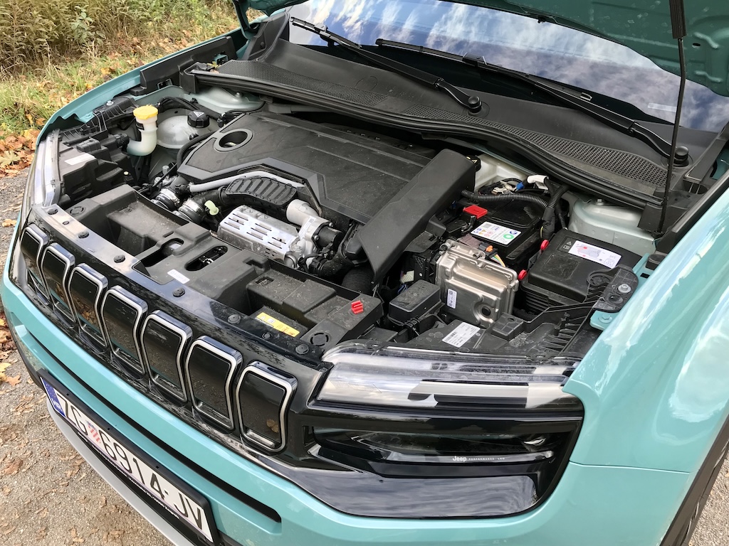Avenger e-Hybrid koristi Stellantisov hibridni sklop: trocilindrični turbobenzinac iz benzinske verzije Avengera ovdje je podržan elektromotorom od 28 KS. Primijenjena je takozvana blaga hibridna tehnologija (MHEV) s 48-voltnom litij-ionskom baterijom kapaciteta 0,9 kWh, što uz umjerena ubrzanja i manje brzine (do 30 km/h) omogućuje 100% električnu vožnju do jednog kilometra. Vrijedi spomenuti da je najavljena i verzija 4xe, s pogonom na sve kotače i dva elektromotora od po 28 KS.