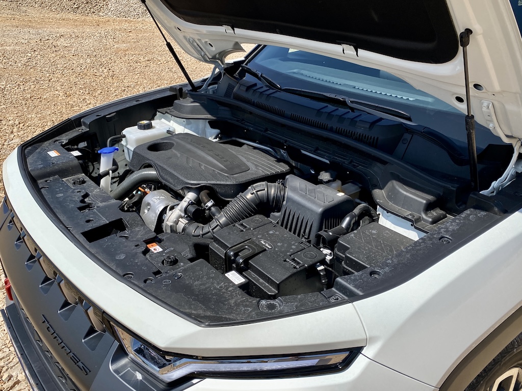 Atraktivna vizualna pojava krije pouzdanu tehniku. Torresa pokreće 1.5 T-GDI benzinac bez električne podrške. Opcije su šest-stupanjski ručni ili automatski mjenjač, te pogon na prednje (4×2) ili sve kotače (4×4 samo uz A/T). Testirali smo izvedbu 4×2 A/T, dakle bez integralnog pogona, ali s automatikom, i smatramo ga idealnom konfiguracijom za one koji trebaju prostrano vozilo za daleka putovanja i planiraju povremene izlete u prirodu, ali ne streme ozbiljnijim off-road aktivnostima – upravo kako temeljna ideja SUV vozila i propisuje.