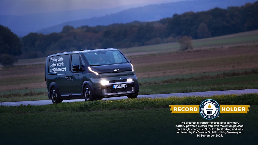 Kia je ispisala povijest, postavljajući novi globalni standard za potpuno električni domet. Kia PV5 Cargo, prvo namjensko električno lako komercijalno vozilo (eLCV) južnokorejskog proizvođača i dio njegove pionirske linije Platform Beyond Vehicle (PBV), službeno je oborio Guinnessov rekord za postignuće: „Najveća udaljenost koju je lako vozilo na baterije prešlo s maksimalnim korisnim teretom s jednim punjenjem iznosi 693,38 km.“ Za testiranje je korištena izvedba PV5 Cargo Long Range s 4 vrata, s baterijom od 71,2 kWh, s maksimalnom dopuštenom nosivošću od 665 kg. S jednim punjenjem prešao je 693,38 kilometara, postavljajući novi standard učinkovitosti i izdržljivosti u segmentu eLCV-a. Rekordna vožnja održana je 30. rujna 2025. u autentičnim, stvarnim uvjetima na javnim cestama sjeverno od Frankfurta u Njemačkoj.