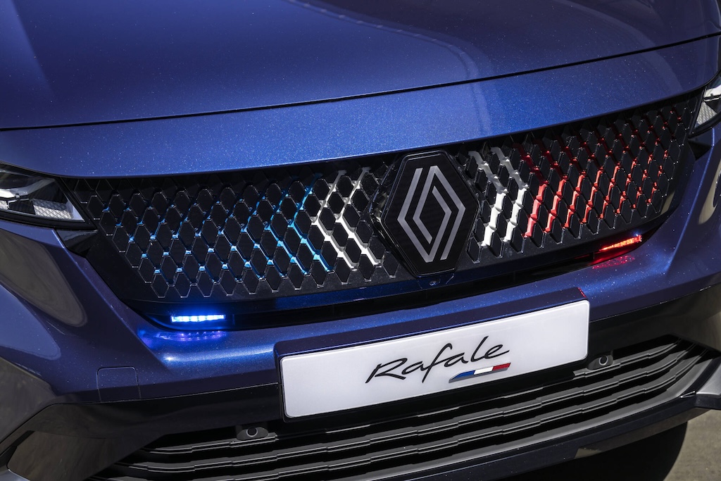 Temeljen na novom Rafaleu Hyper Hybrid E-Tech 4×4 300 KS, ovaj jedinstveni automobil utjelovljuje francusku inovativnost, izdržljivost i izvrsnost. Dizajniran u Renaultovu centru u Guyancourtu, Rafale donosi smjelu i elegantnu viziju brenda. Izvana, predsjednička inačica odiše klasičnim, skladnim linijama, oplemenjenim diskretnim, ali prepoznatljivim detaljima: rešetkom u bojama francuske zastave, uklonjivim nosačima zastava te plavim, bijelim i crvenim oznakama na prednjim vratima. Karoserija ekskluzivne plave boje Bleu Présidence unaprijeđena je tehnologijom koja ograničava apsorpciju topline na 10 °C, čime se povećava udobnost u unutrašnjosti. Osim toga, pod sunčevim zrakama stvara svjetlucavi odsjaj u bojama francuske trobojnice. Stražnja vrata imaju mehanizam mekog zatvaranja koji osigurava tiho i elegantno zatvaranje, u skladu s protokolom. Nosači zastava diskretno su smješteni iza malih poklopaca kako bi se postigao profinjen i dostojanstven izgled vozila tijekom službenih putovanja.
